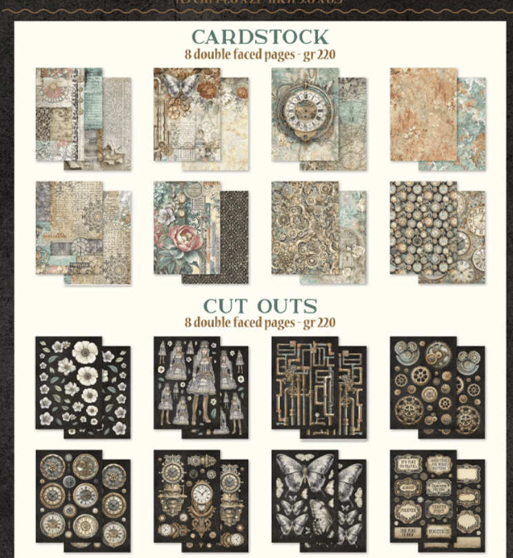8 double faces pages CARDSTOCK - gr 220; 8 double faces pages CUT OUTS - gr 220. A5 / cm 14.8 x 21 / 5.8 x 8.3 inch.